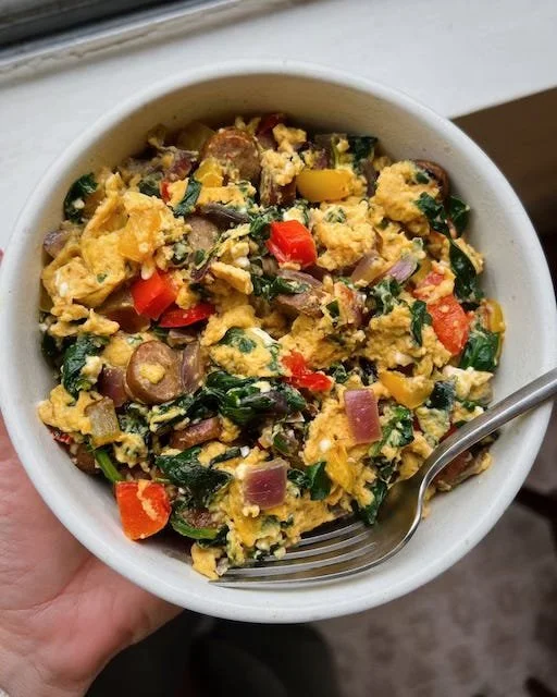 This is a classic, loaded scramble—savory sausage, soft eggs, and a ton of sautéed veggies. It’s hearty, colorful, and built to actually keep you full through the morning.