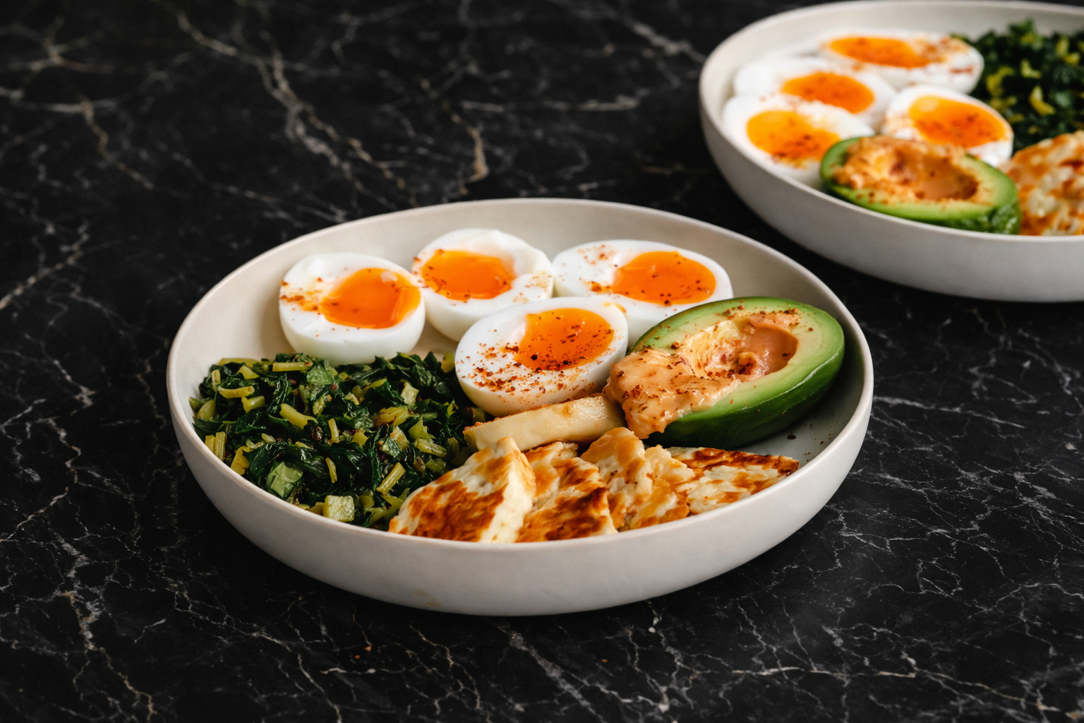 In a separate pan, crack eggs and cook over medium-low heat until whites are set but yolks stay runny (about 3–4 minutes). Cover briefly if needed to set the tops.Assemble bowls