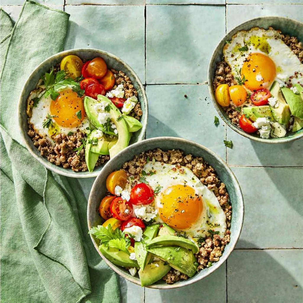 Most mornings, it ends up being some version of a loaded egg scramble or breakfast bowl. Simple, high-protein, and built from whatever’s in the fridge—and these three recipes are the ones I keep coming back to.